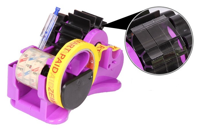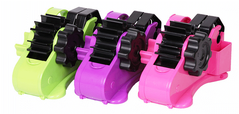 2. מתקן דיספנסר עבור סלוטייפ אחד ברוחב 4 ס"מ או 2 סלוטייפים ברוחב עד 1.9 ס"מ כל אחד – פשוט מסובבים את הגלגלת בצד המתקן ואוטומטית נחתכים 3 או 6 רצועות דבק בגדלים שווים של 4.6 ס"מ כל אחד